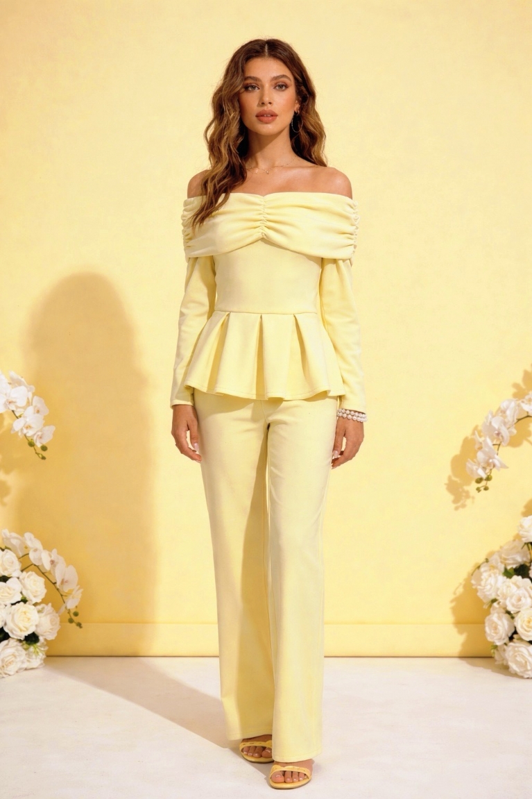 Αναδείξτε το στυλ σας με το εντυπωσιακό set παντελόνι & μπλούζα off shoulder σε φωτεινό κίτρινο χρώμα.