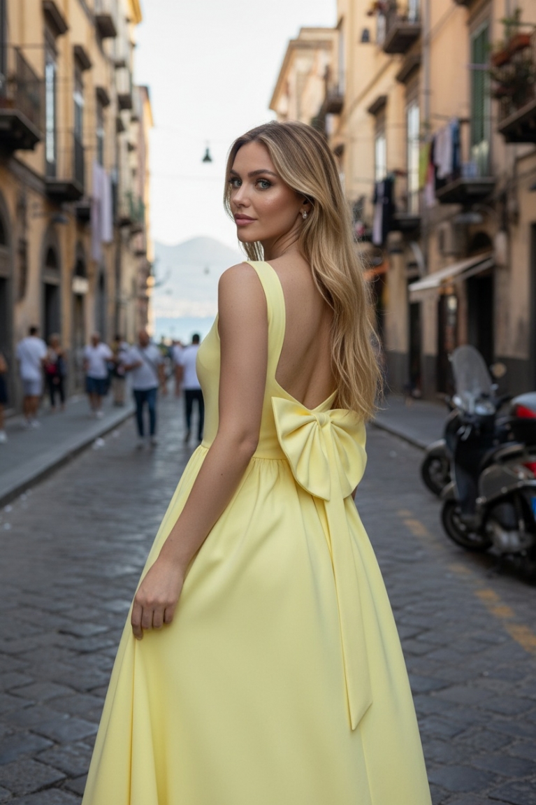 Αναδείξτε τη θηλυκότητά σας με το maxi φόρεμα σε λαμπερό κίτρινο χρώμα και εντυπωσιακό φιόγκο στην πλάτη.