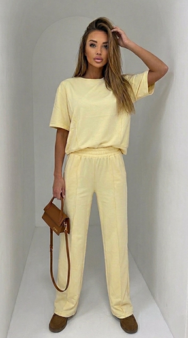 Αναδείξτε το στυλ σας με αυτό το μοναδικό σετ φόρμας σε υπέροχο κίτρινο χρώμα.