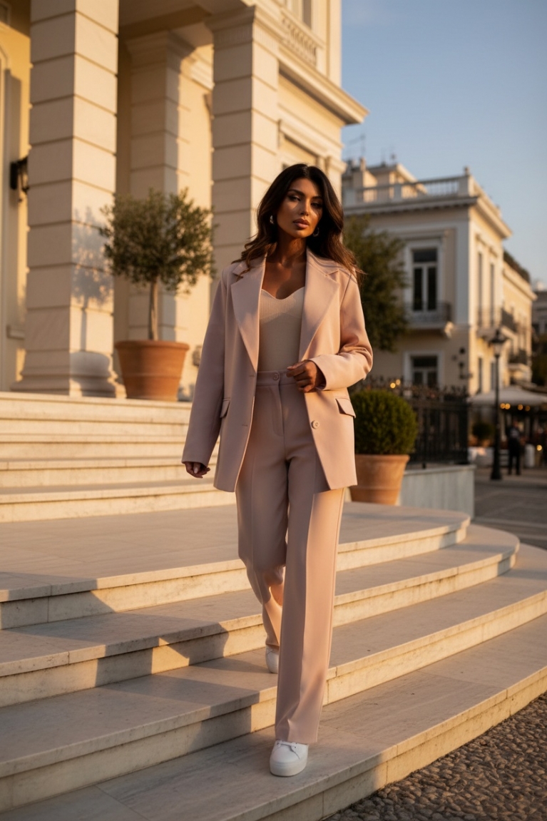 Ανανεώστε το στυλ σας με το Σετ Κοστούμι Line σε ροζ παλ απόχρωση που μαγνητίζει τα βλέμματα.