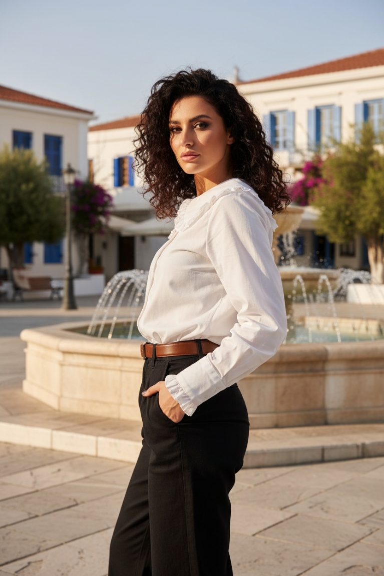 Αναδείξτε το στυλ σας με το λευκό πουκάμισο με μεγάλο γιακά και βολάν, που συνδυάζει τη διαχρονική κομψότητα με μοντέρνες λεπτομέρειες.