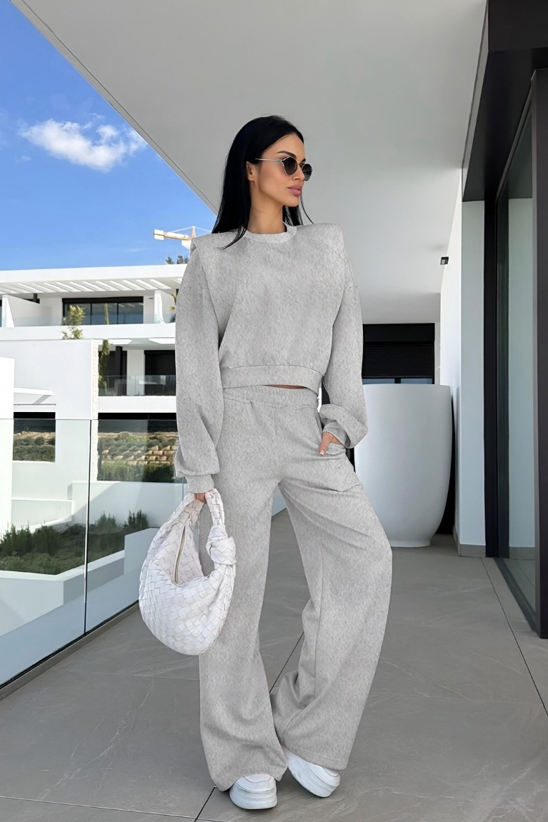 Η μπλούζα με βάτες προσδίδει δυναμικό χαρακτήρα και κομψότητα, ενώ το παντελόνι με λάστιχο στη μέση εξασφαλίζει τέλεια εφαρμογή και ευκολία κινήσεων.