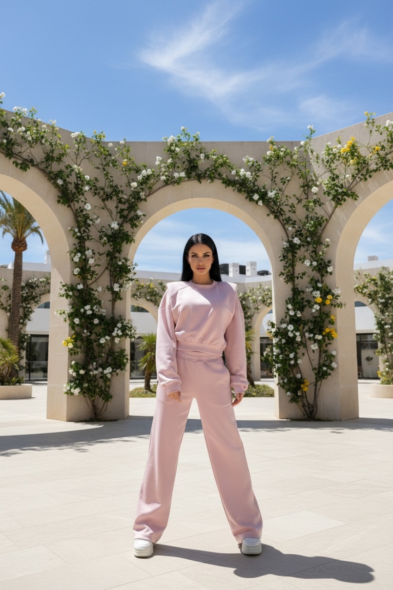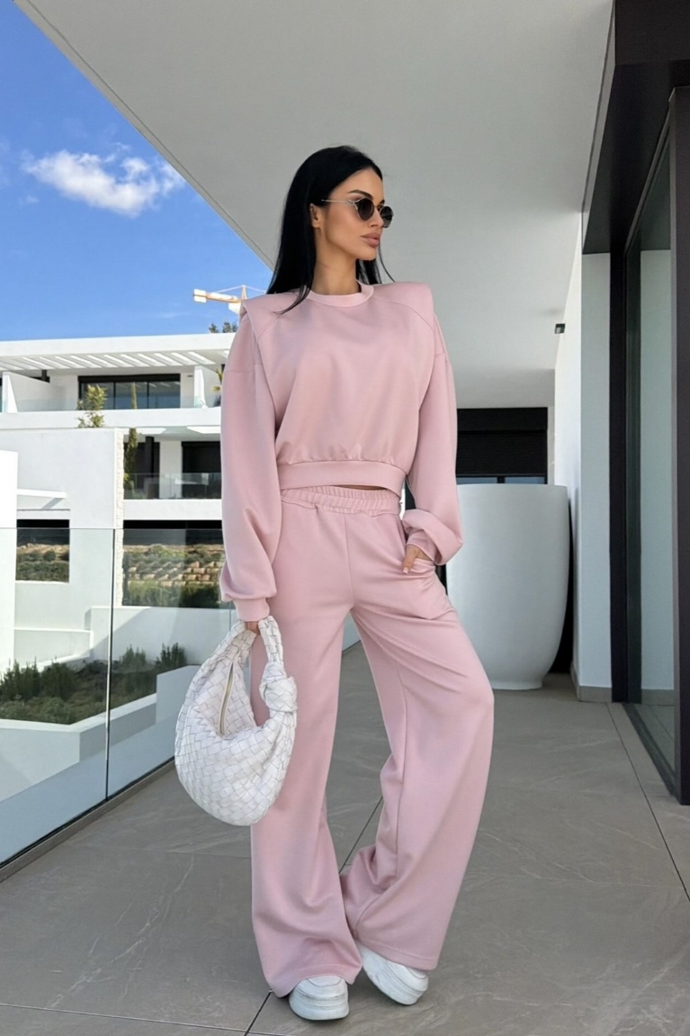 Ανανεώστε το στυλ σας με το Σετ Φόρμας Παντελόνι με Λάστιχο & Μπλούζα με Βάτες σε ροζ παλ απόχρωση.
