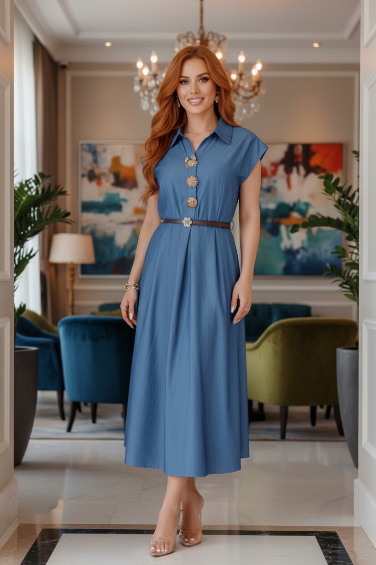 Αναδείξτε το στυλ σας με το εντυπωσιακό Φόρεμα Denim Look με Διακοσμητικά Κουμπιά & Ζώνη σε υπέροχη μπλε απόχρωση.