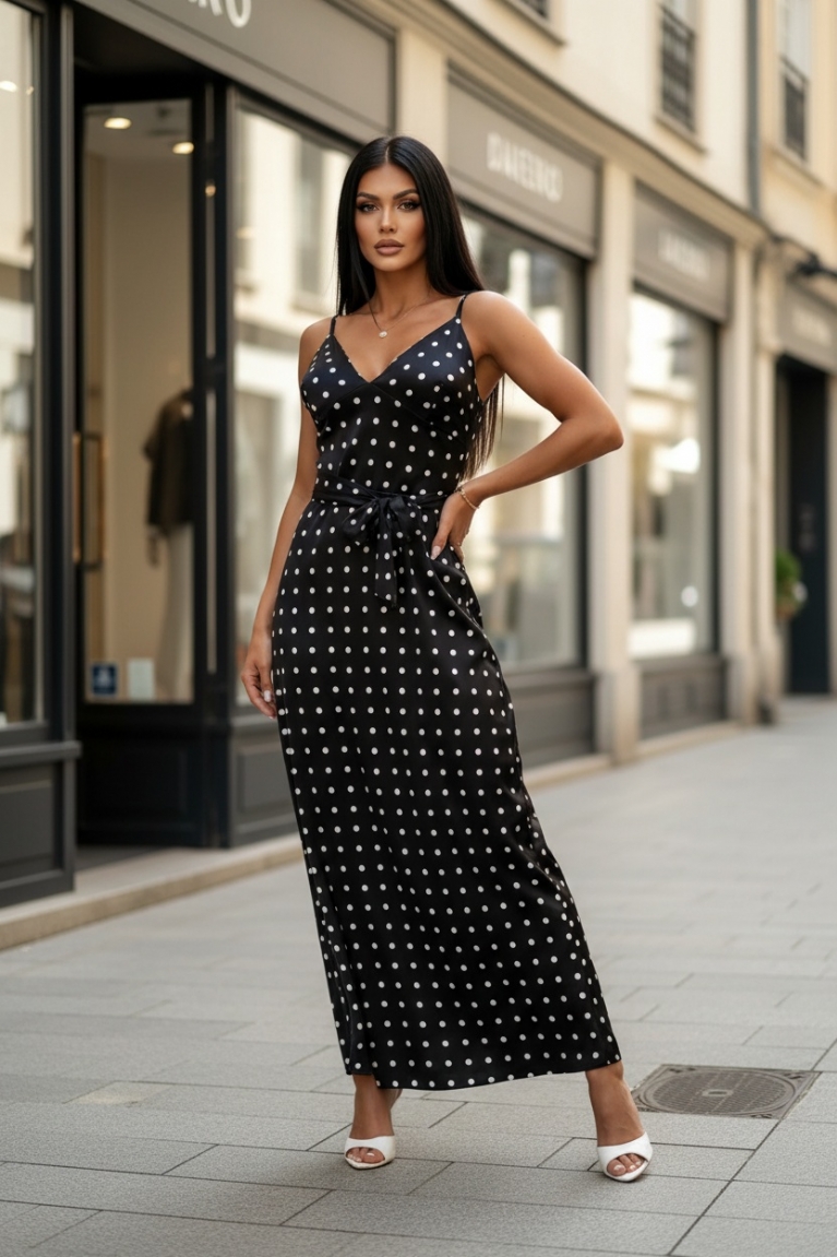 Αναδείξτε τη θηλυκότητά σας με το μάξι πουά φόρεμα σε μαύρο χρώμα, που συνδυάζει κομψότητα και διαχρονικό στιλ.