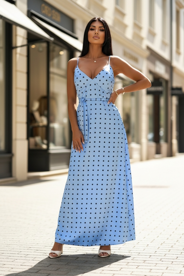 Αναδείξτε τη θηλυκότητά σας με αυτό το υπέροχο μάξι πουά φόρεμα σε γαλάζιο χρώμα.