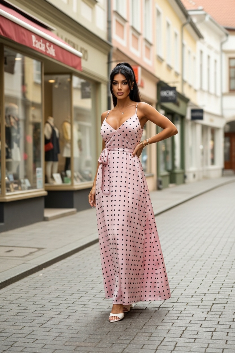 Αναδείξτε τη θηλυκότητά σας με το μάξι πουά φόρεμα σε ροζ χρώμα που θα τραβήξει όλα τα βλέμματα.