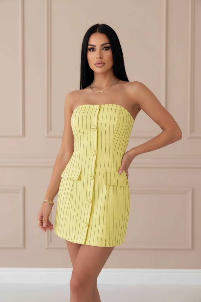 Αναδείξτε το μοναδικό σας στυλ με το ριγέ στράπλες μίνι φόρεμα σε φωτεινό κίτρινο χρώμα.
