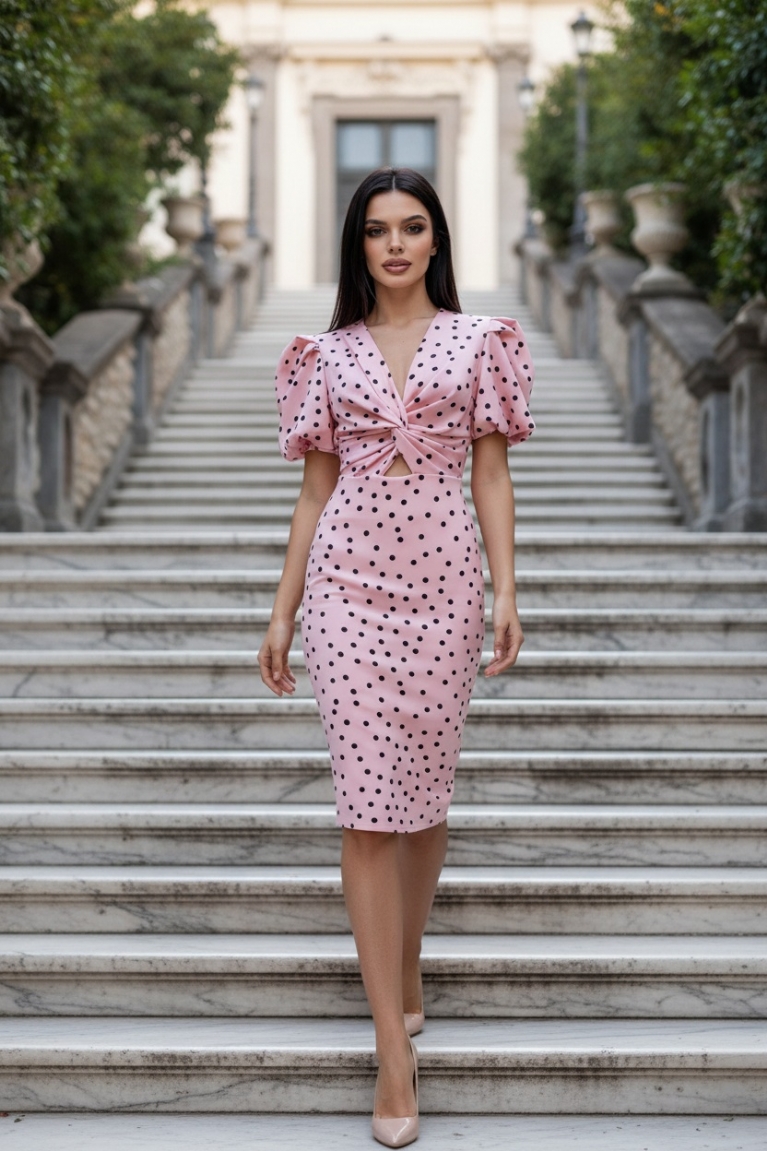 Midi Πουά Φόρεμα με Puff Μανίκια - Ροζ