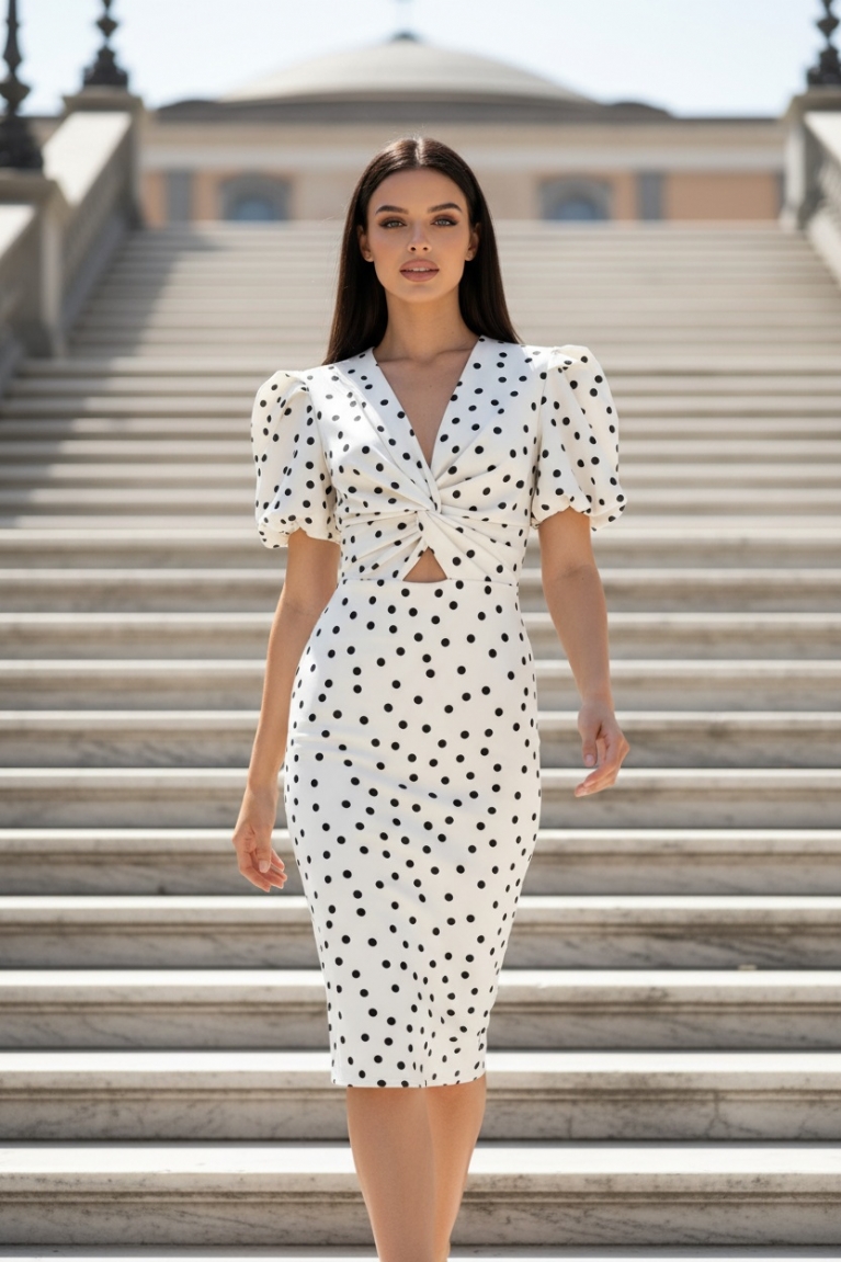 Αναδείξτε τη θηλυκότητά σας με το μοναδικό midi πουά φόρεμα με puff μανίκια σε λευκό χρώμα.