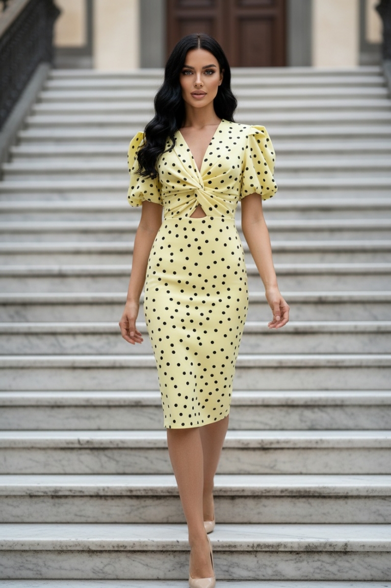 Αναδείξτε το στιλ σας με το midi πουά φόρεμα σε λαμπερό κίτρινο χρώμα και εντυπωσιακά puff μανίκια.