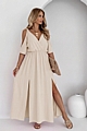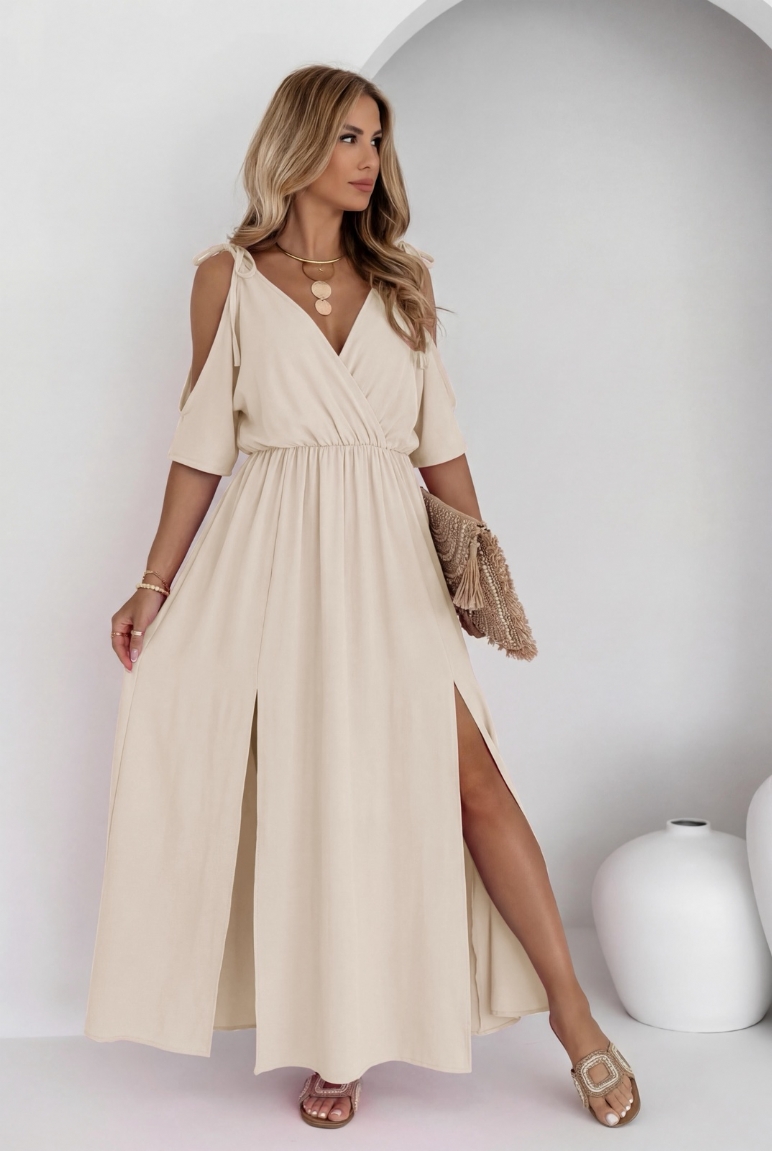 Φόρεμα maxi σε μπεζ χρώμα με άνοιγμα στους ώμους και σκισίματα στο κάτω μέρος. - Κίτρινο