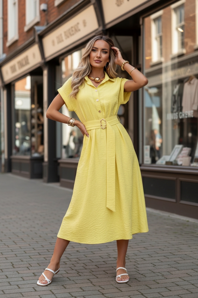 Μίντι Σεμιζιέ Φόρεμα με Ζώνη - Κίτρινο