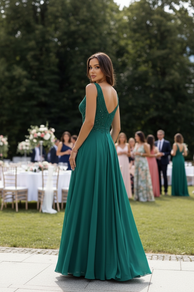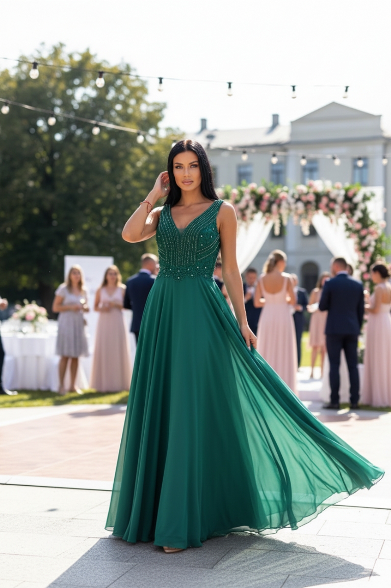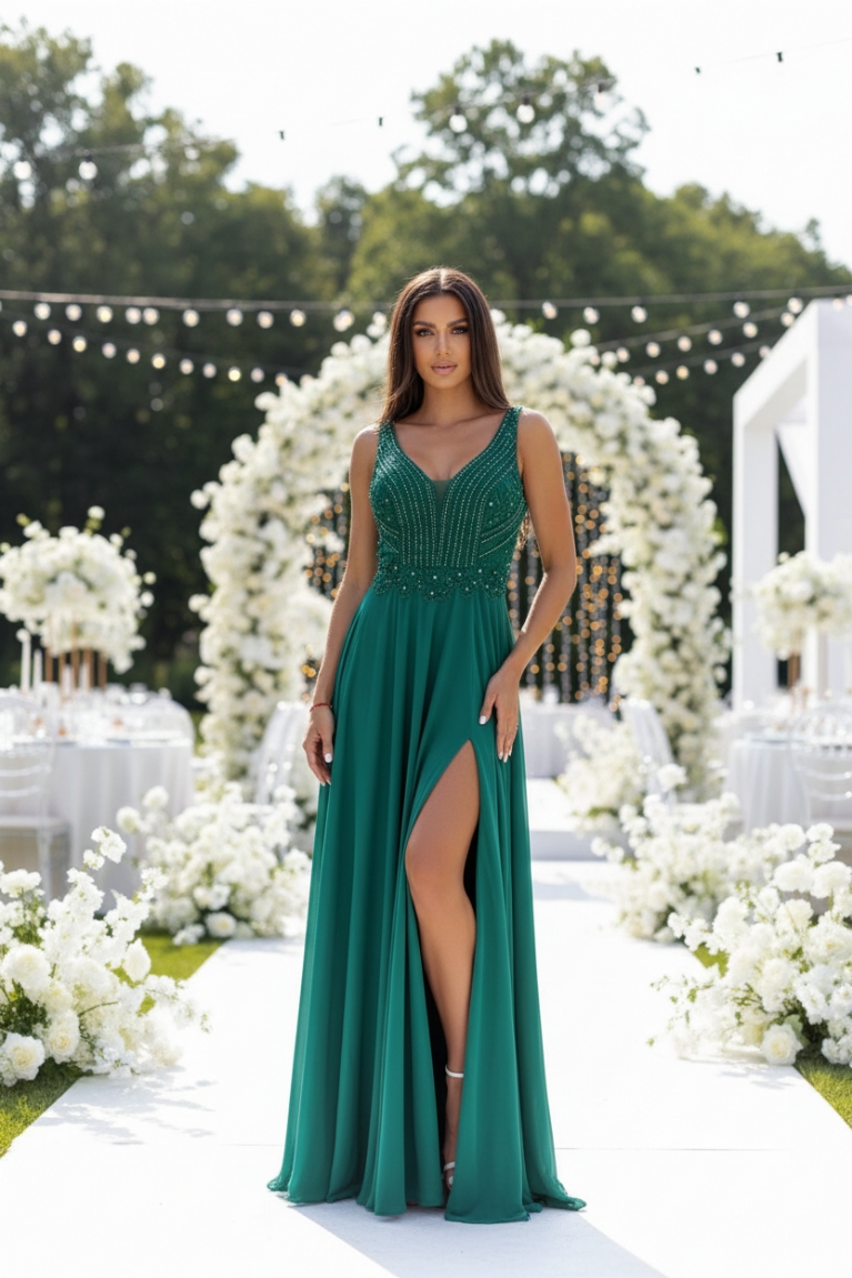 Αέρινο Maxi Φόρεμα με Λαμπερή Λαιμόκοψη - Κυπαρισσί