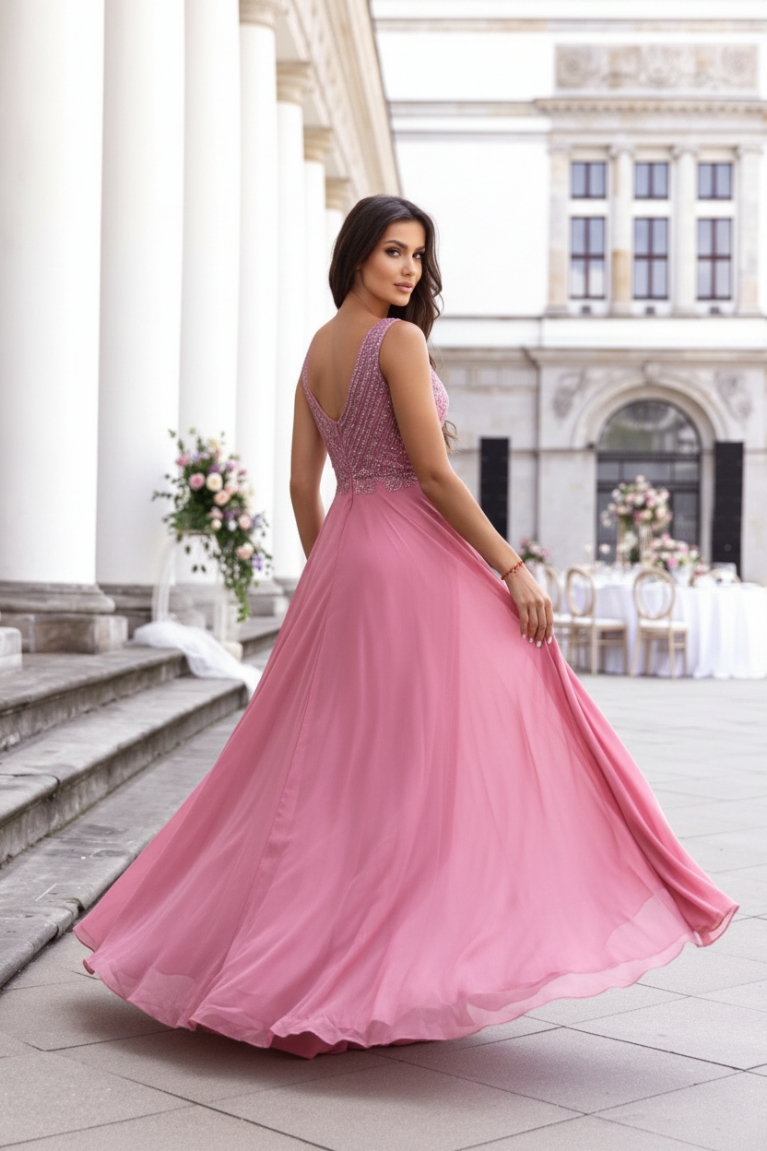 Αέρινο Maxi Φόρεμα με Λαμπερή Λαιμόκοψη - Ροζ