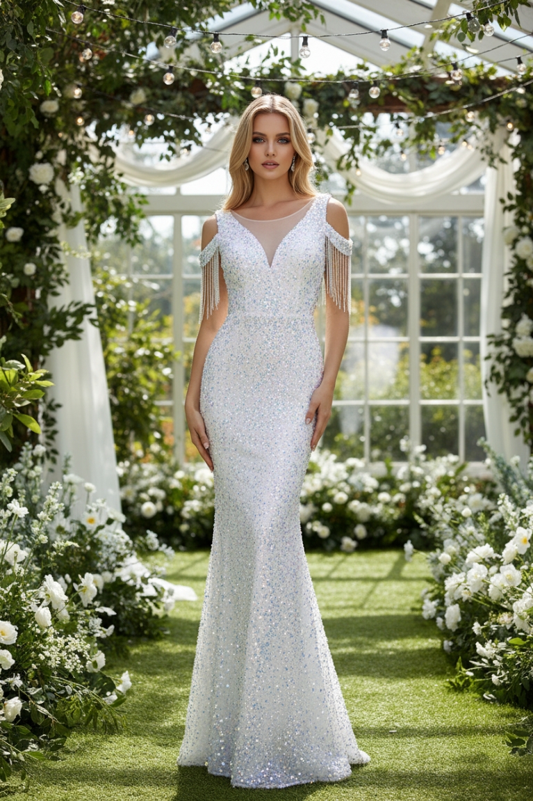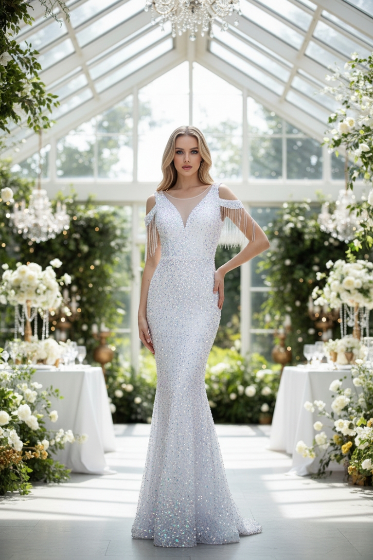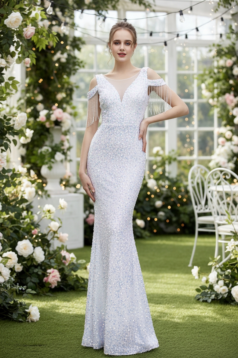 Off Shoulder Φόρεμα σε Στυλ Γοργόνας με Παγιέτες, Κρόσσια & V Πλάτη - Λευκό