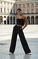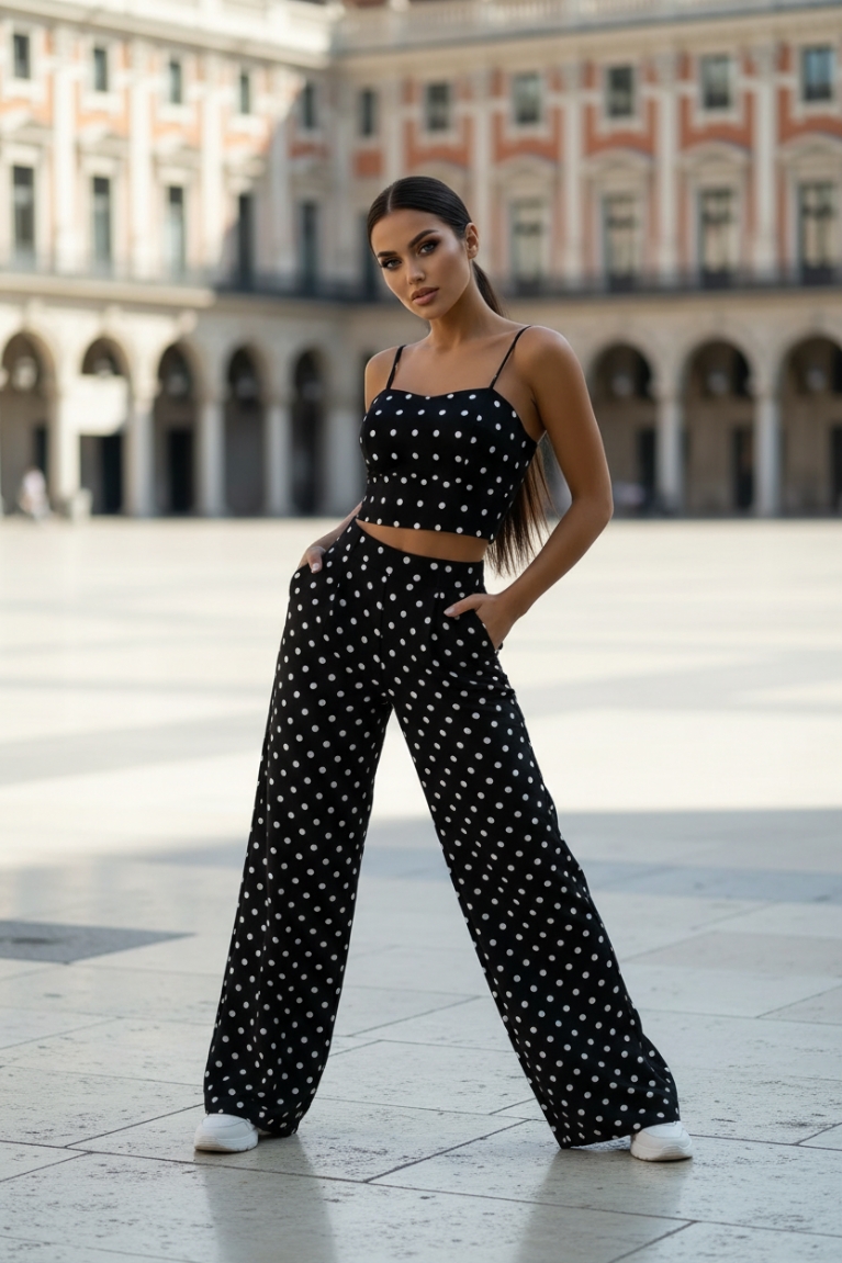 Το crop top με λεπτές τιράντες χαρίζει θηλυκότητα και μοντέρνα διάθεση, ενώ το παντελόνι με τα εντυπωσιακά πουά προσθέτει μια παιχνιδιάρικη αλλά διαχρονική πινελιά στην εμφάνισή σας.