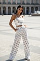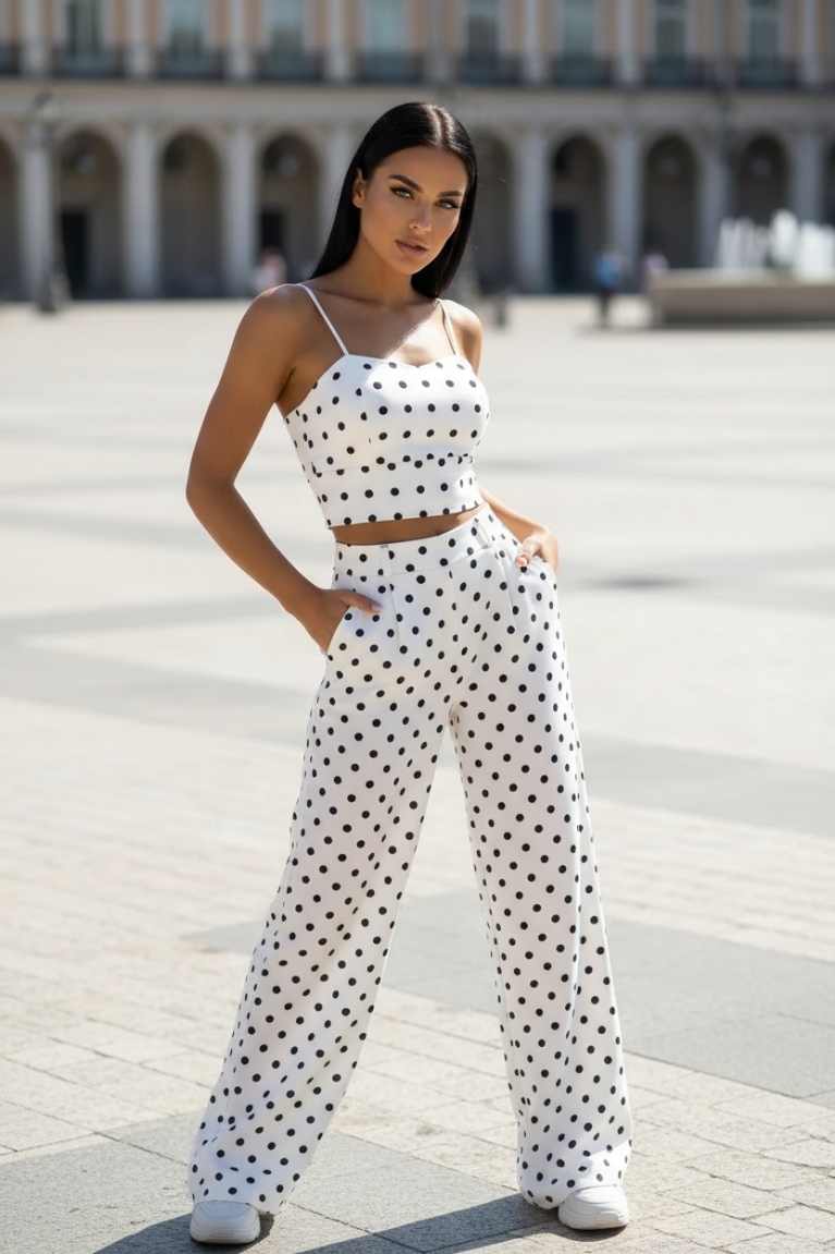 Αναδείξτε το μοναδικό σας στυλ με το λευκό σετ παντελόνι πουά & crop top, σχεδιασμένο για να ξεχωρίζει σε κάθε σας εμφάνιση.