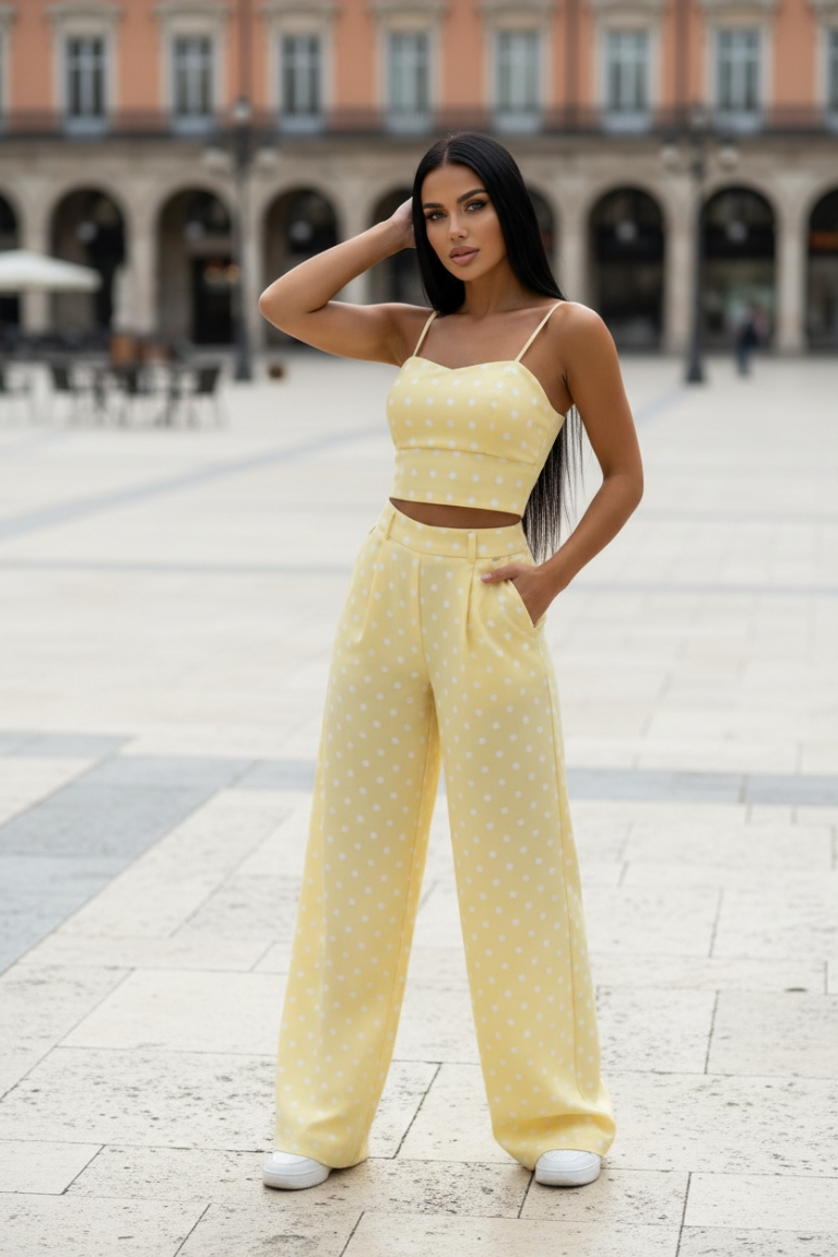 Σετ Παντελόνι Πουά & Crop Top - Κίτρινο