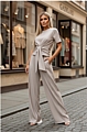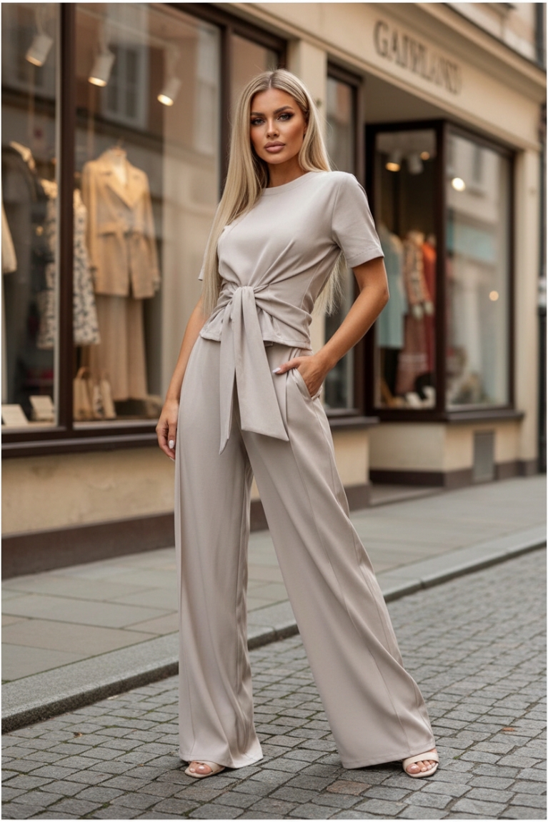 Ανανεώστε το στιλ σας με το μοναδικό σετ top με δέσιμο και παντελόνα σε κομψό μπεζ χρώμα.