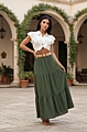 Αναδείξτε το στυλ σας με τη Maxi Φούστα με Ζώνη στη Μέση σε κομψό λαδί χρώμα.