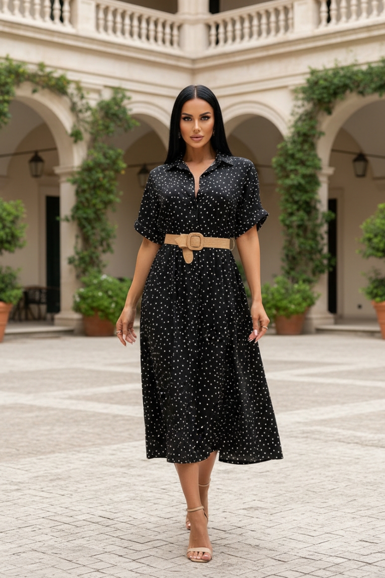 Αναδείξτε τη θηλυκότητα και τη φινέτσα σας με το Midi Λεπτό Πουά Φόρεμα με Ζώνη σε μαύρο χρώμα.