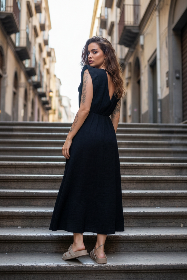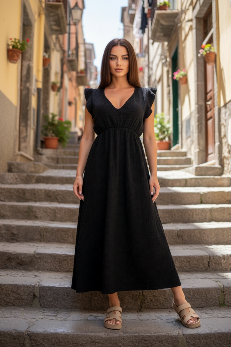 Midi Φόρεμα με "V" Λαιμόκοψη - Μαύρο