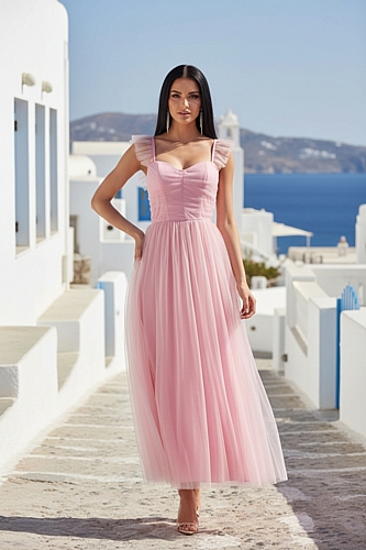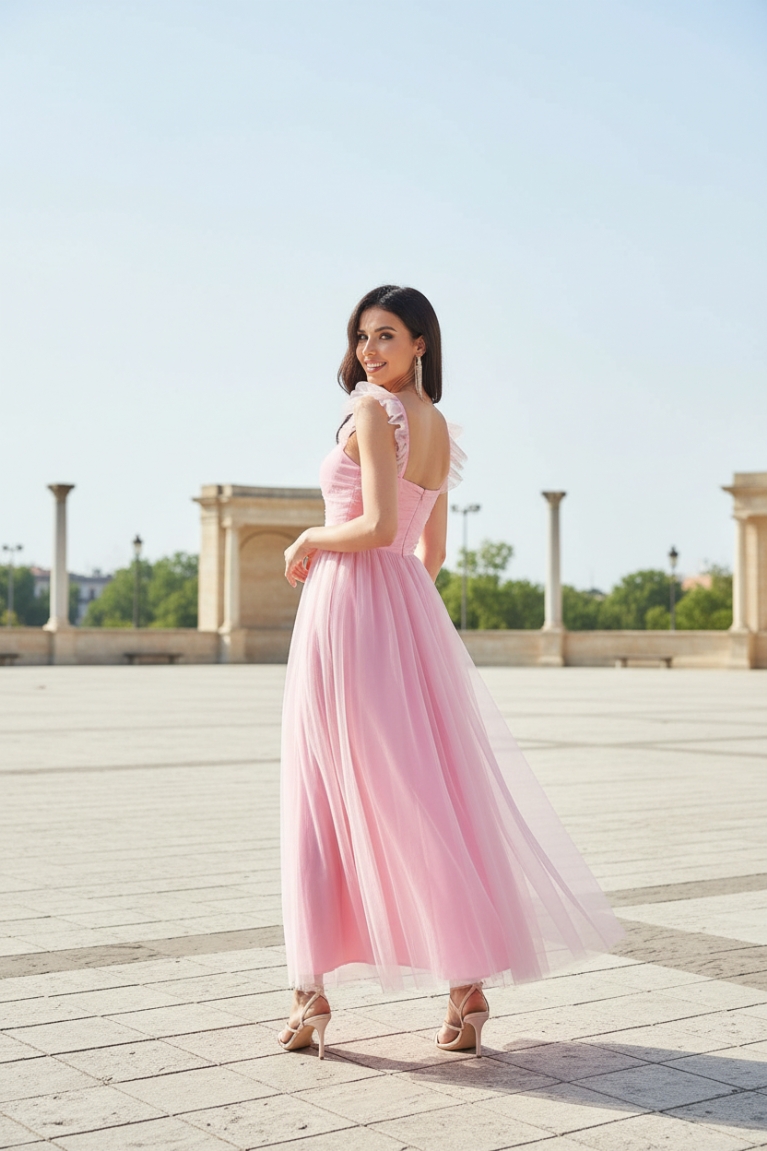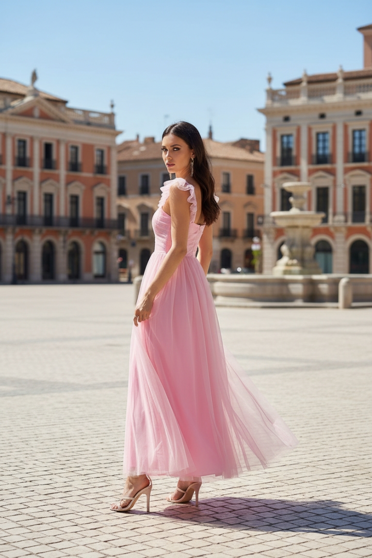 Αναδείξτε τη θηλυκότητά σας με το τούλινο φόρεμα maxi με βολάν σε ροζ απόχρωση, που μαγνητίζει τα βλέμματα με την αέρινη γραμμή του.