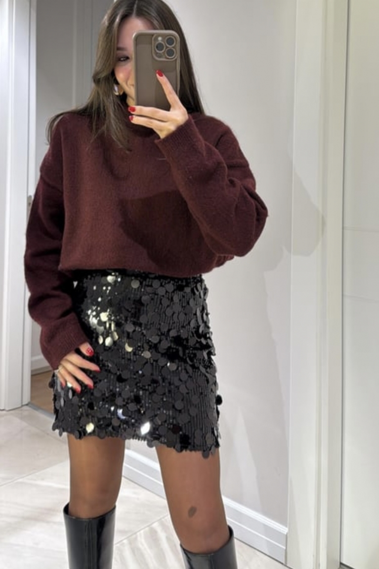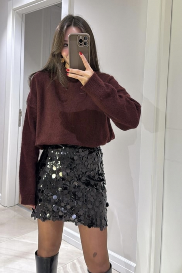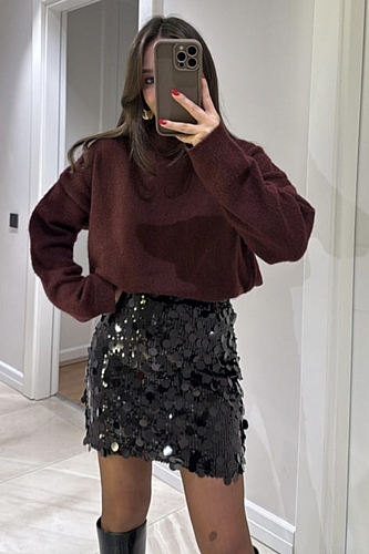 Εντυπωσιάστε με τη διαχρονική και λαμπερή ψηλόμεση φούστα μίνι με μαύρη παγιέτα, η ιδανική επιλογή για βραδινές εμφανίσεις γεμάτες κομψότητα και μυστήριο. Το μαύρο χρώμα συνδυάζει την κλασική φινέτσα με το μοντέρνο στιλ, ενώ οι παγιέτες προσθέτουν μία διακριτική λάμψη που τραβάει τα βλέμματα. Το ψηλόμεσο σχέδιο αγκαλιάζει άψογα τη μέση, αναδεικνύοντας τη θηλυκότητα και τη σιλουέτα σας. Συνδυάστε την με ένα πλεκτό τοπ ή μία μπλούζα σε έντονες αποχρώσεις για ένα chic και αρμονικό αποτέλεσμα. Κατάλληλη για πάρτι, γιορτές και κάθε περίσταση που απαιτεί έναν glam τόνο.