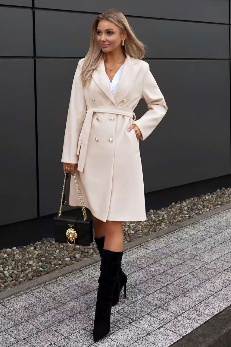Αναδείξτε το στυλ σας με το παλτό σε εκρού απόχρωση που διαθέτει εντυπωσιακά χρυσά κουμπιά και κομψές βάτες στους ώμους.