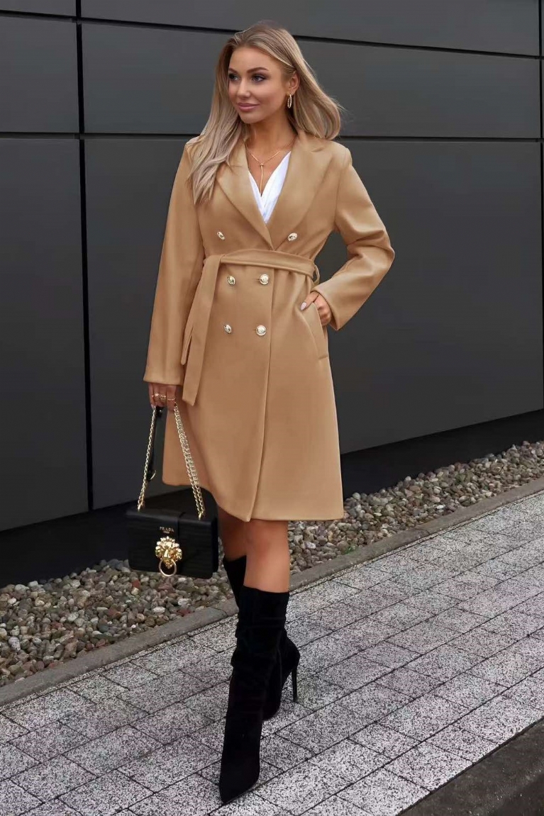 Αναδείξτε το στυλ σας με το εκλεπτυσμένο παλτό σε μπεζ απόχρωση, διακοσμημένο με εντυπωσιακά χρυσά κουμπιά.