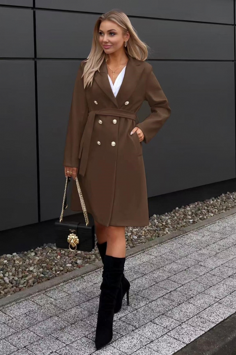 Απογείωσε το στυλ σου με το καφέ παλτό με χρυσά κουμπιά και βάτες στους ώμους.