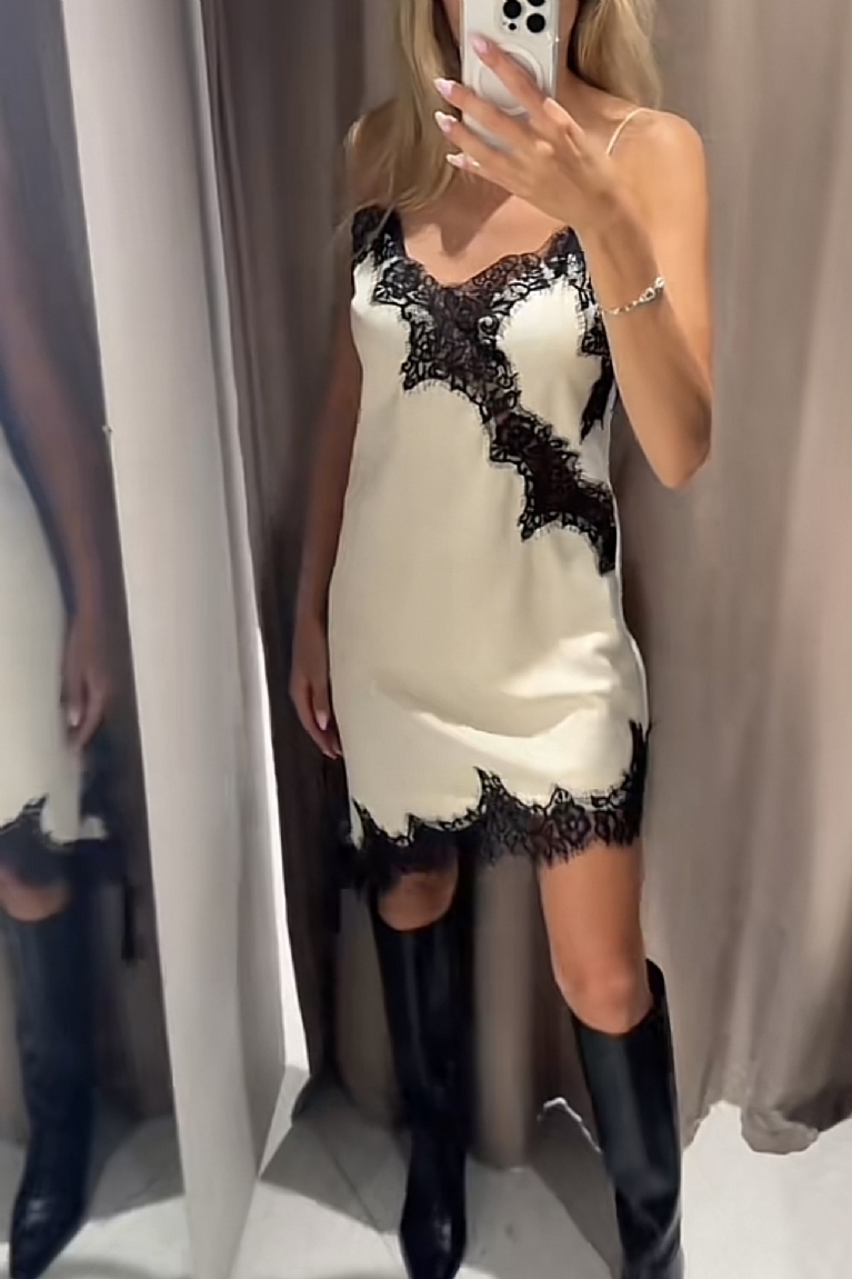 Ανακάλυψε την απόλυτη κομψότητα με το σατέν ασύμμετρο φόρεμα με δαντέλα σε εκρού απόχρωση.