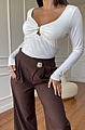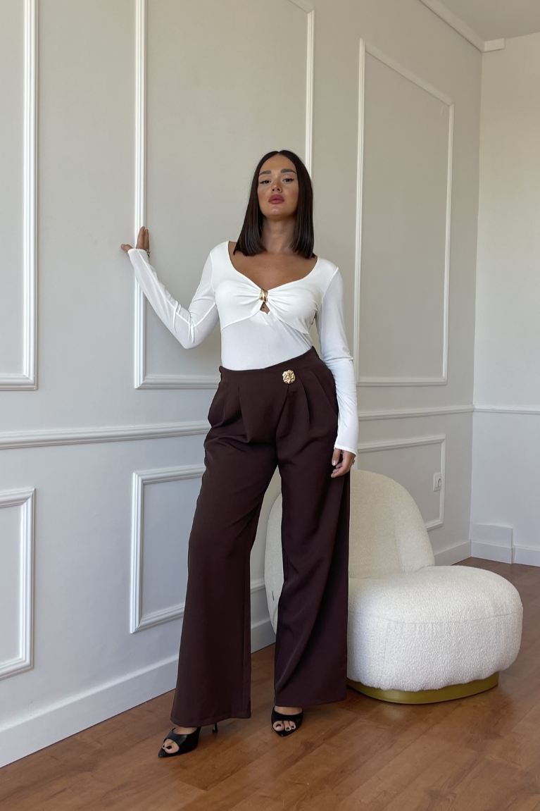 Ο μοντέρνος σχεδιασμός με διακριτικό κόψιμο στο ντεκολτέ συνδυάζεται άψογα με την εκλεπτυσμένη χρυσή αγκράφα, προσφέροντας μια ιδιαίτερη πινελιά πολυτέλειας.