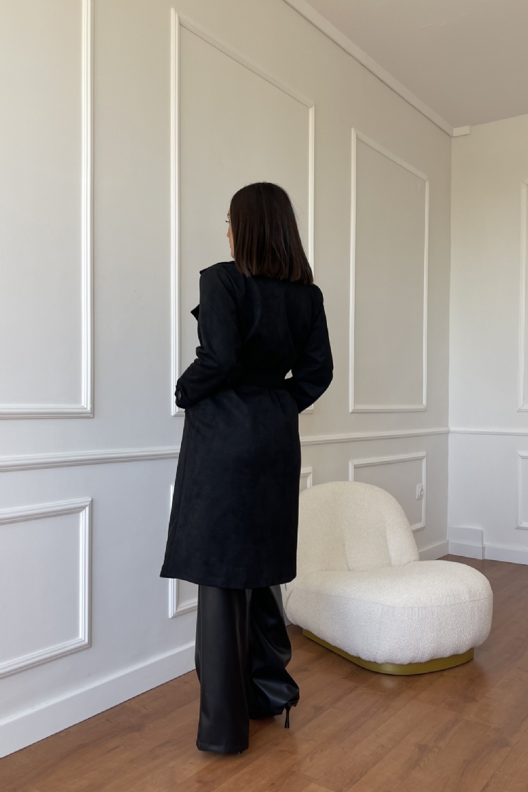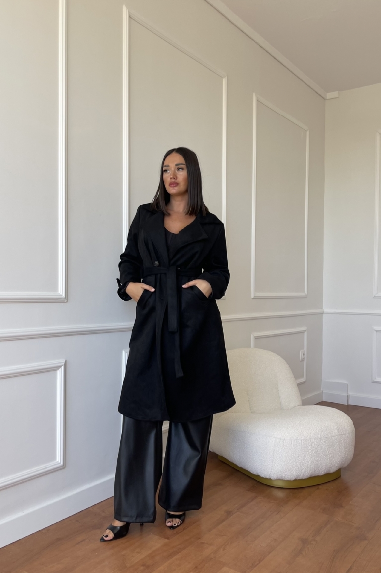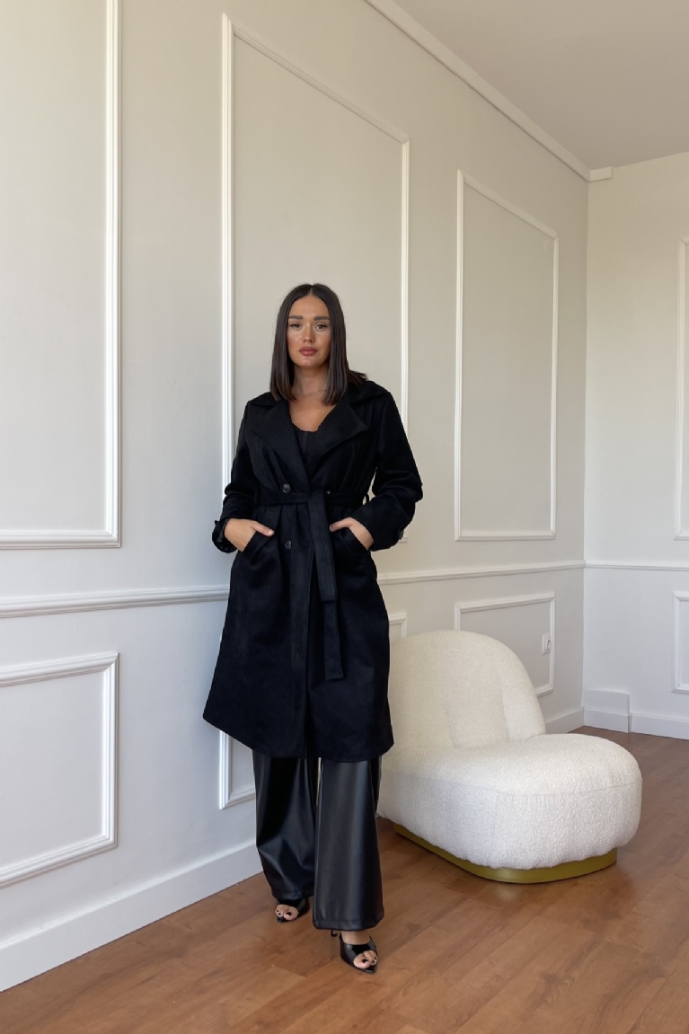Αναδείξτε το στυλ σας με την καμπαρντίνα σουέτ με ζώνη σε μαύρο χρώμα.