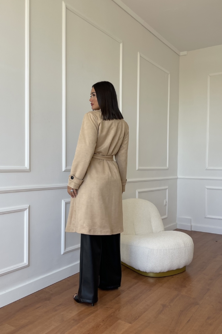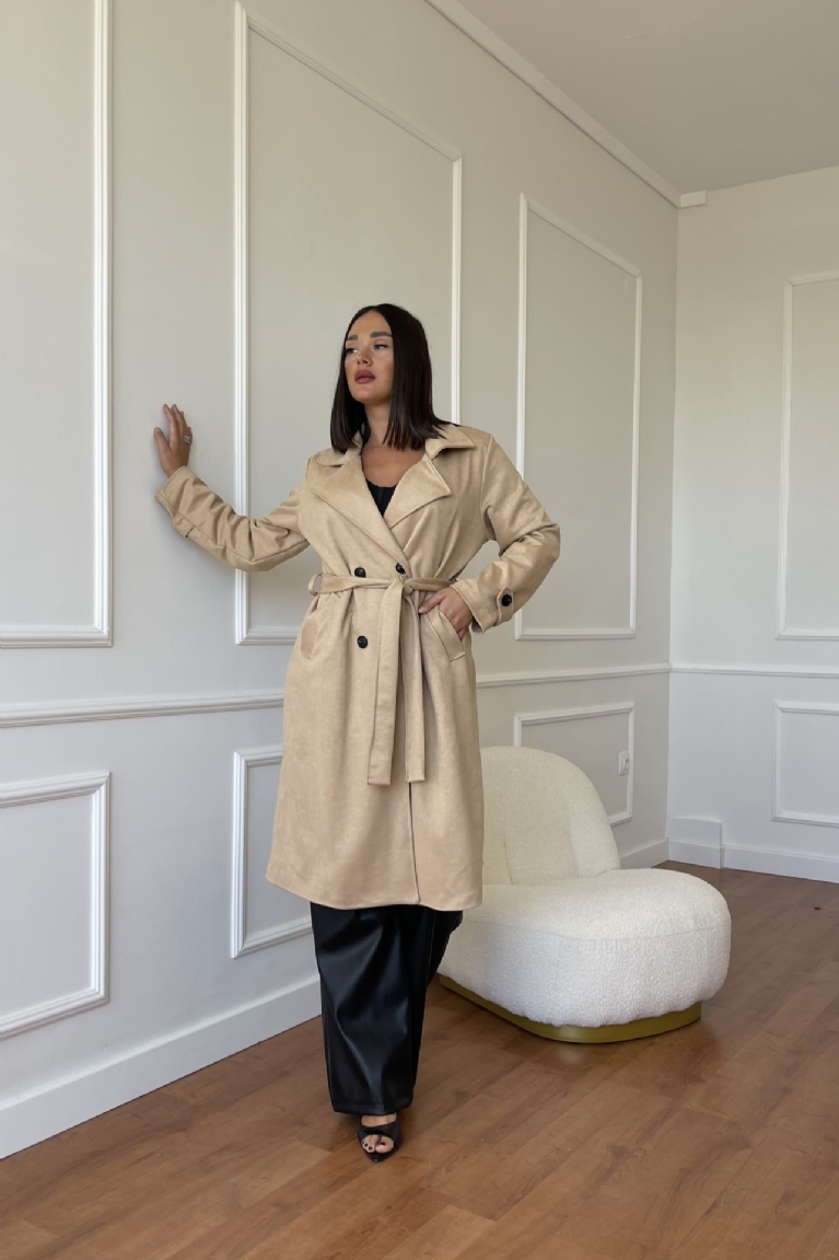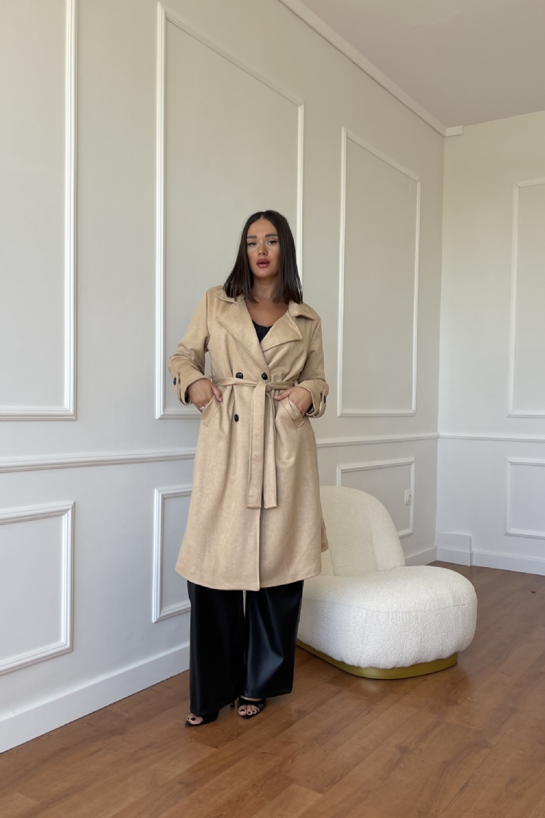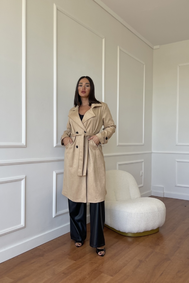 Αναβαθμίστε το στυλ σας με την καμπαρντίνα σουέτ με ζώνη σε διαχρονικό μπεζ χρώμα.