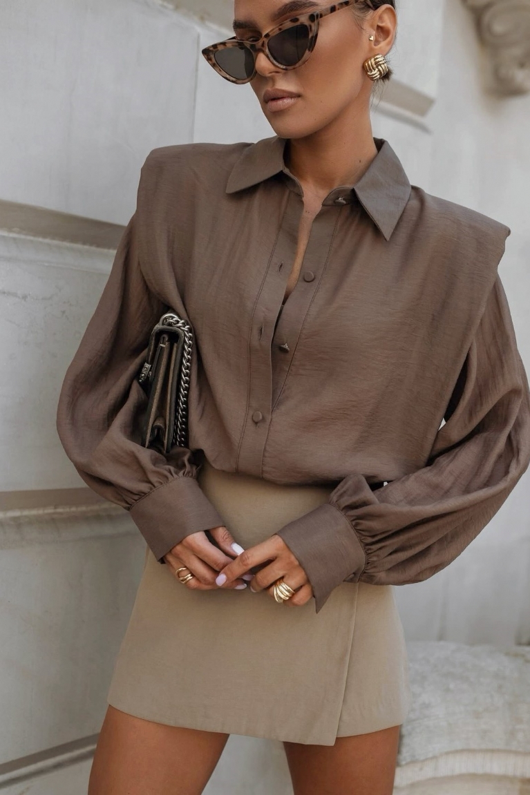 Αναδείξτε το στιλ σας με το πουκάμισο με βάτες στους ώμους σε κομψή καφέ απόχρωση.