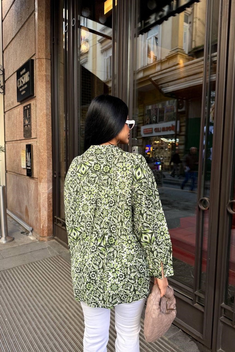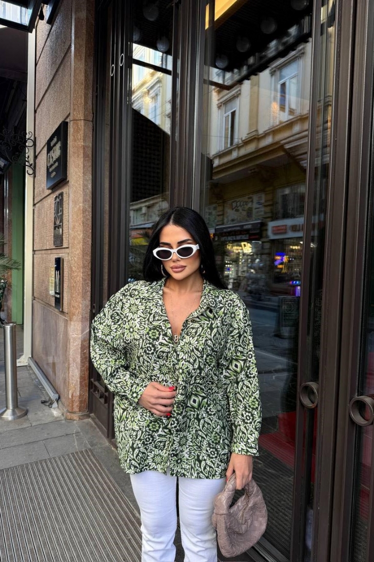 Αναδείξτε το προσωπικό σας στυλ με το εμπριμέ oversize πουκάμισο σε πράσινο χρώμα, που μαγνητίζει τα βλέμματα με το μοντέρνο σχέδιό του.