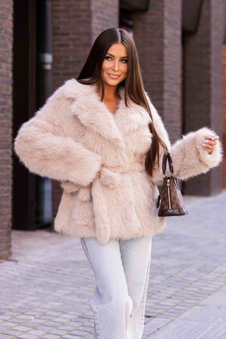 Αναδείξτε το στυλ σας με αυτή τη μπεζ γούνα με ζώνη που προσφέρει μοναδική αίσθηση πολυτέλειας και άνεσης.