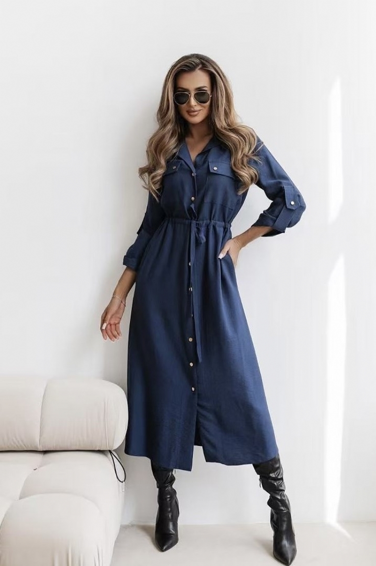 Ανανεώστε το στυλ σας με αυτό το εντυπωσιακό midi φόρεμα σε μπλε απόχρωση και κομψά κουμπιά.