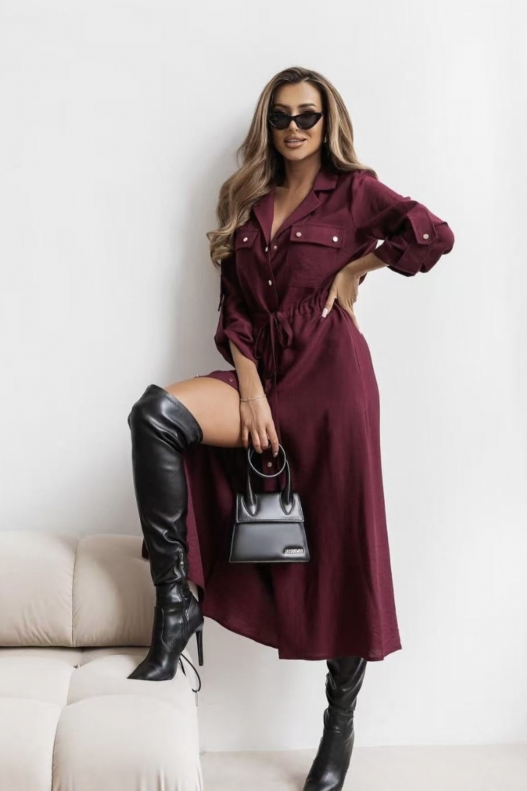 Αναδείξτε τη θηλυκότητά σας με το midi φόρεμα σε μπορντό απόχρωση, που διαθέτει κομψά κουμπιά και ζώνη για τέλεια εφαρμογή.