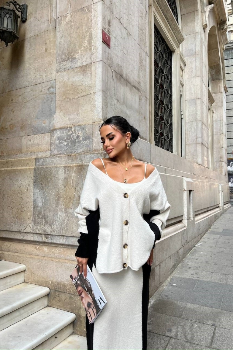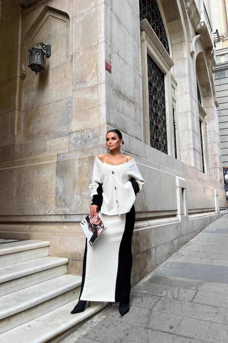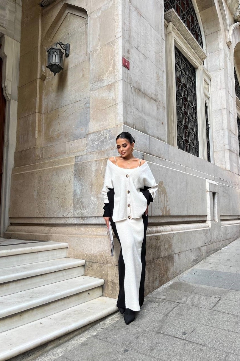 Αναδείξτε το στυλ σας με το κομψό σετ πλεκτής ζακέτας με κουμπιά και φούστα με διχρωμία, σε λευκή απόχρωση.