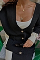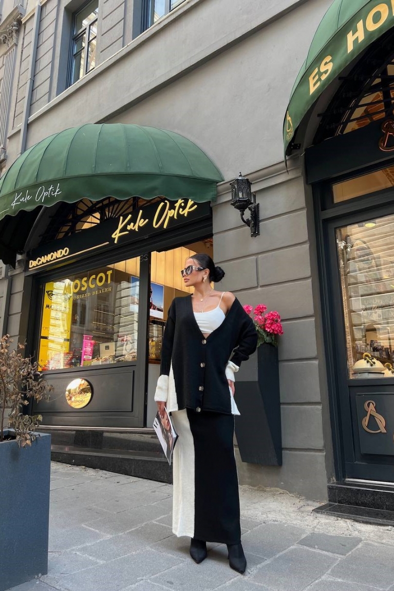 Αναδείξτε το στυλ σας με το σετ πλεκτής ζακέτας με κουμπιά και φούστας με διχρωμία, σε κομψό μαύρο χρώμα.