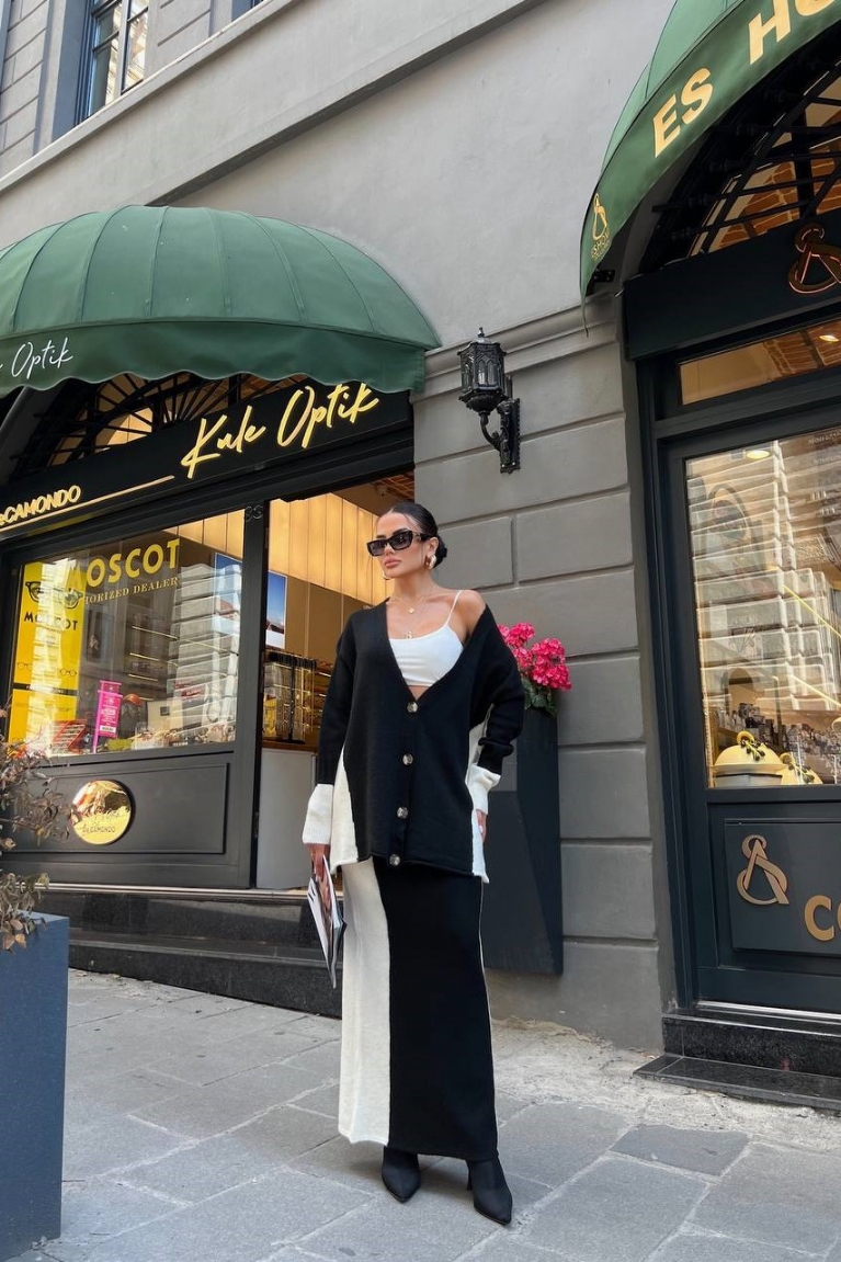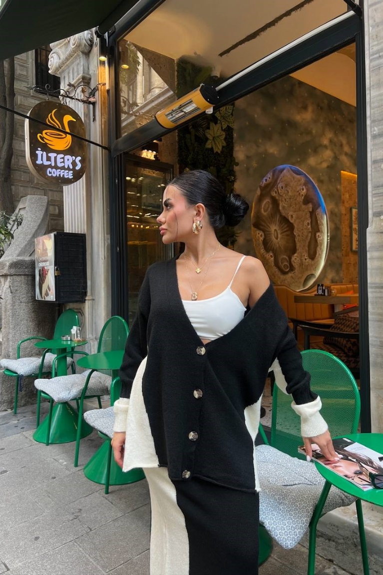 Σετ Πλεκτή Ζακέτα Με Κουμπιά & Φούστα Με Διχρωμία - Μαύρο