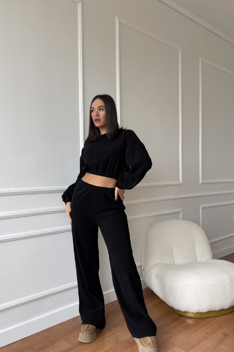 Ανανεώστε το στυλ σας με αυτό το κομψό σετ κοτλέ μπλούζα crop και παντελόνα σε μαύρο χρώμα.