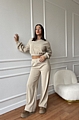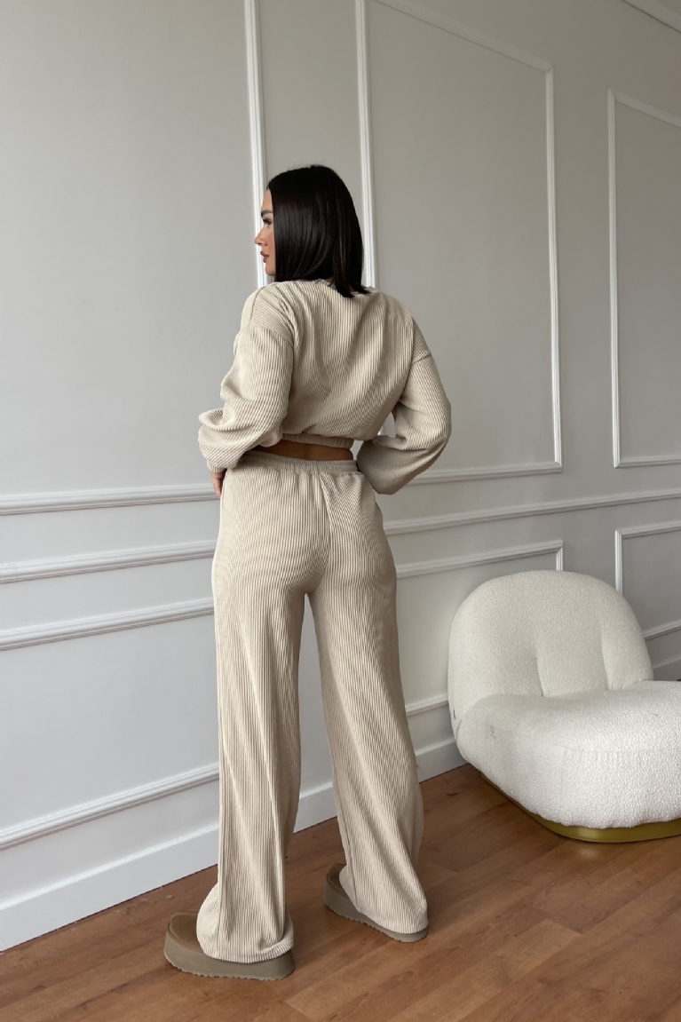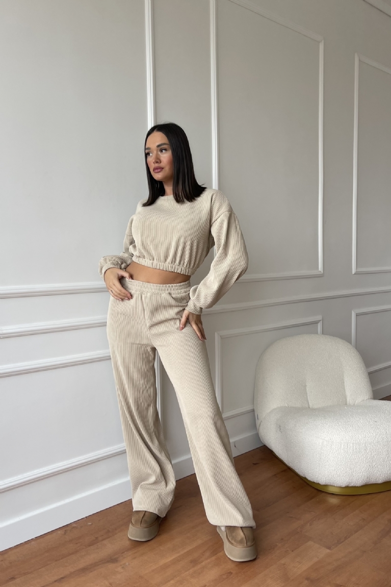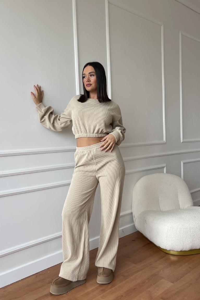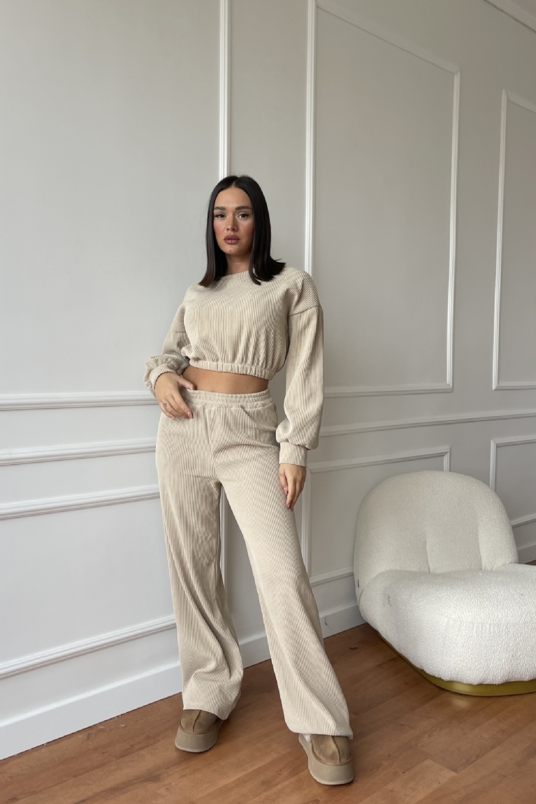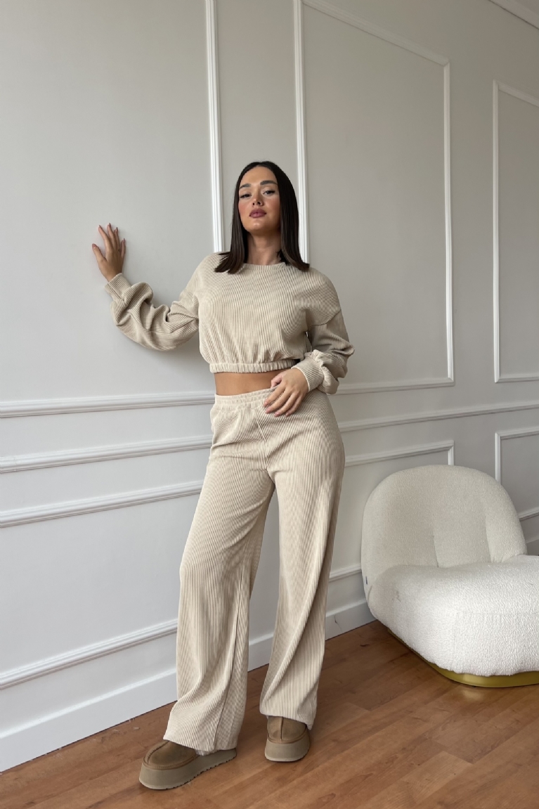 Σετ Κοτλέ Μπλούζα Crop & Παντελόνα - Μπεζ