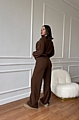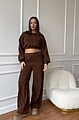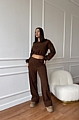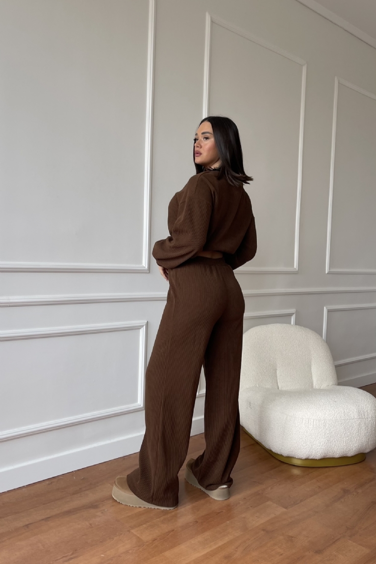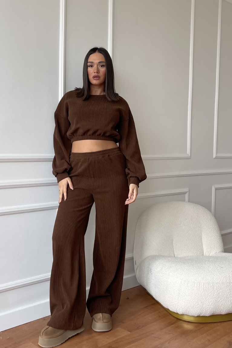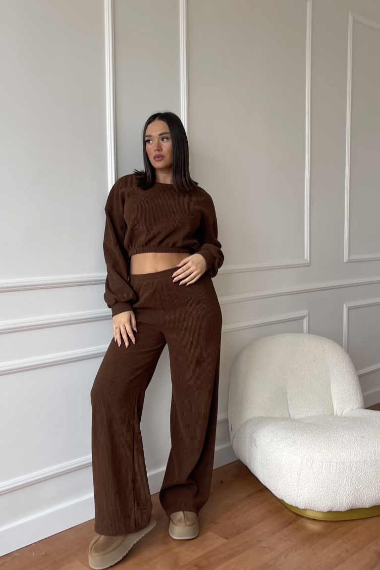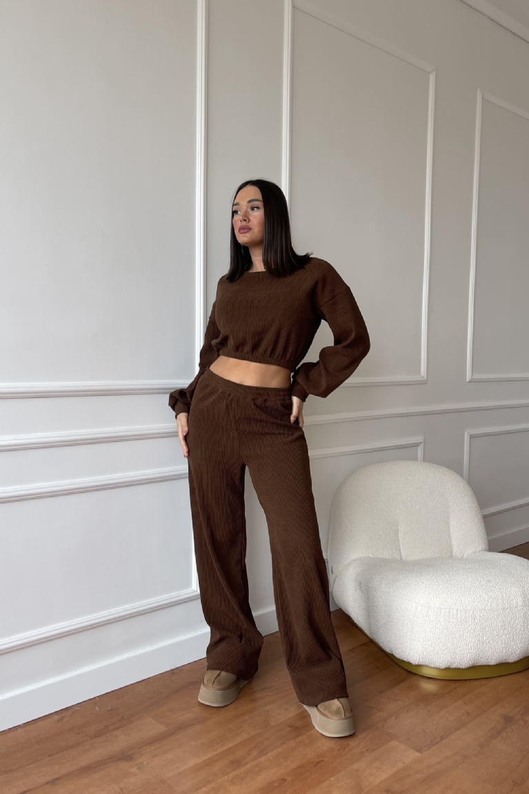 Σετ Κοτλέ Μπλούζα Crop & Παντελόνα - Καφέ