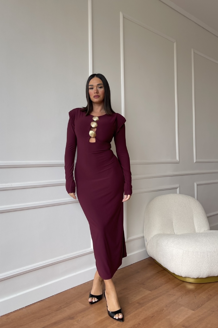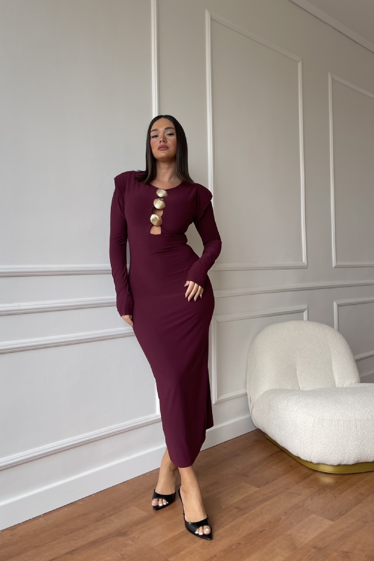 Φόρεμα Midi Μακρυμάνικο Με Χρυσές Λεπτομέρειες - Μπορντό