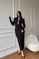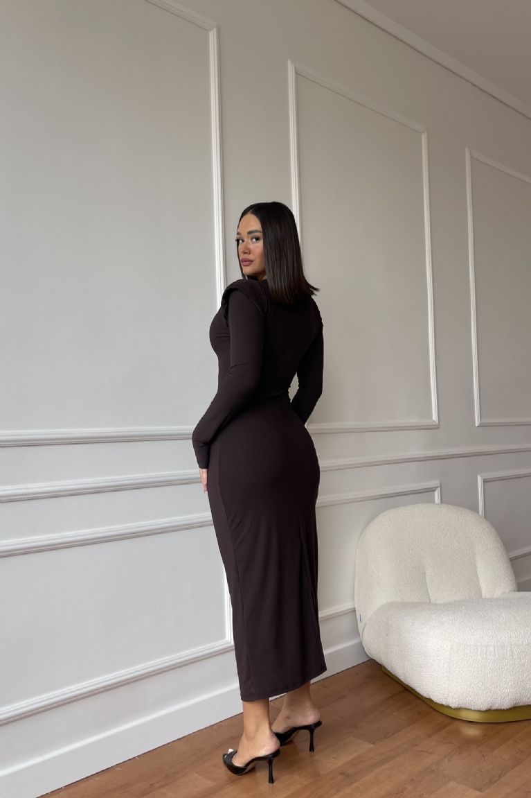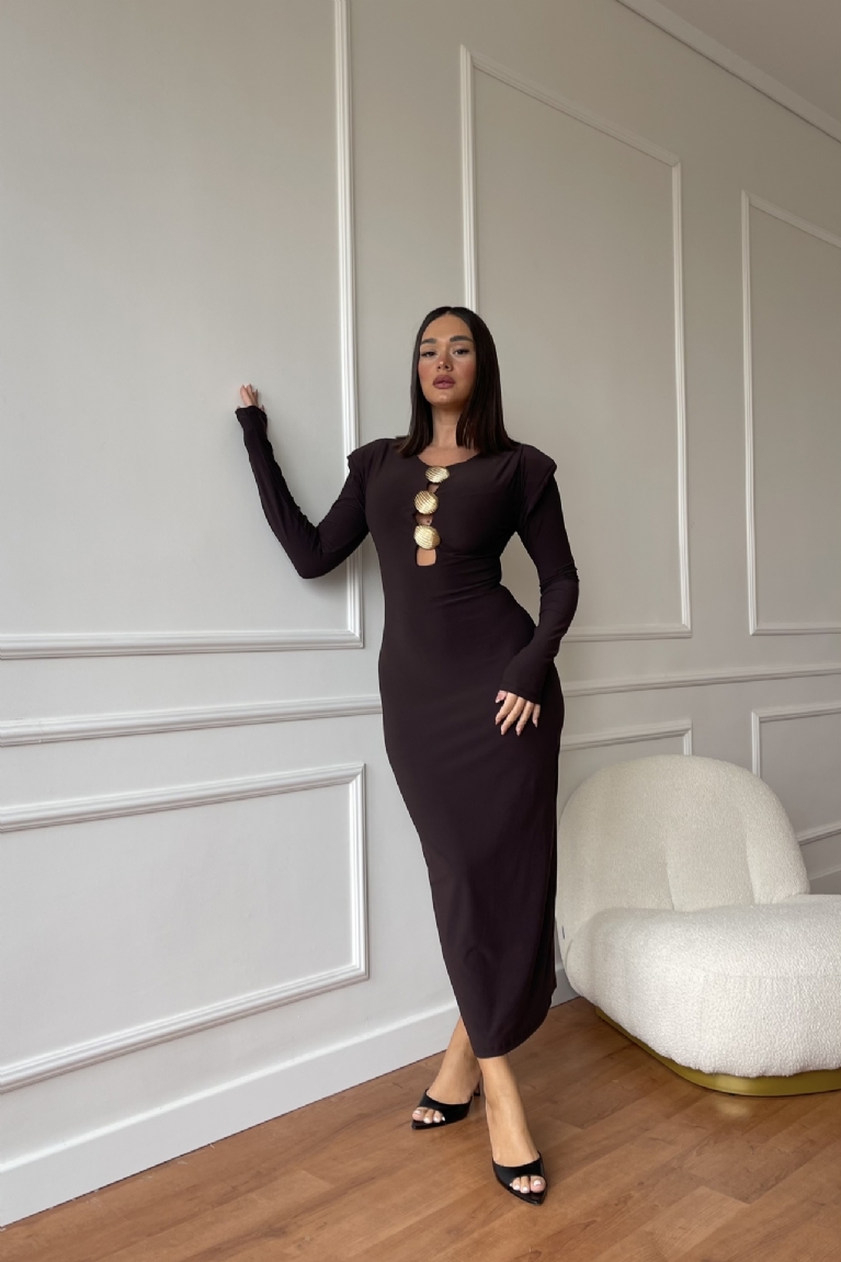 Αναδείξτε τη θηλυκότητά σας με το midi μακρυμάνικο φόρεμα σε καφέ χρώμα, διακοσμημένο με εντυπωσιακές χρυσές λεπτομέρειες.