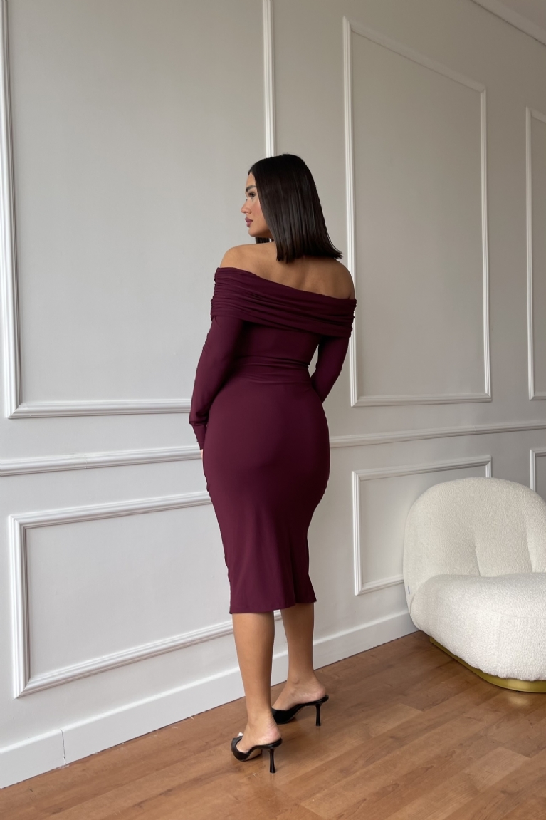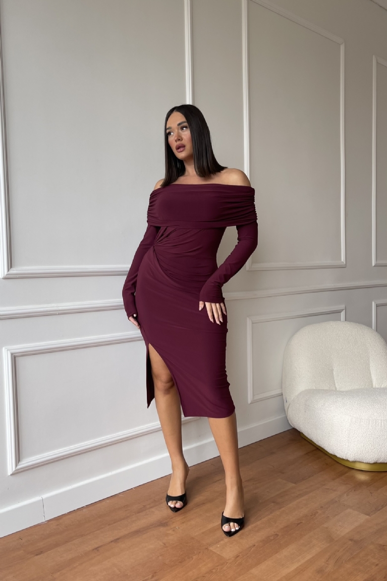 Φόρεμα Midi Έξωμο Με Σκίσιμο - Μπορντό